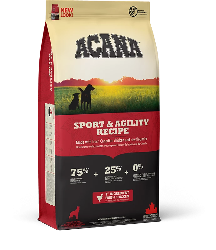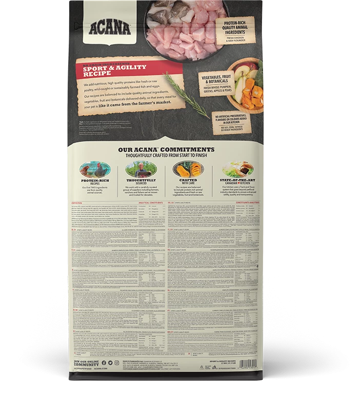 Bereid in onze gecertificeerde keukens in Canada is Acana Dog hondenvoer Sport & Agility rijk aan lokaal gefokte scharrel kip, scharrel eieren, in het wild gevangen platvis, zongerijpt fruit en groenten – geleverd rijk aan voedingsstoffen en door boeren en telers uit onze regio zodat jouw actieve hond in optimale fysiekeconditie blijft.
