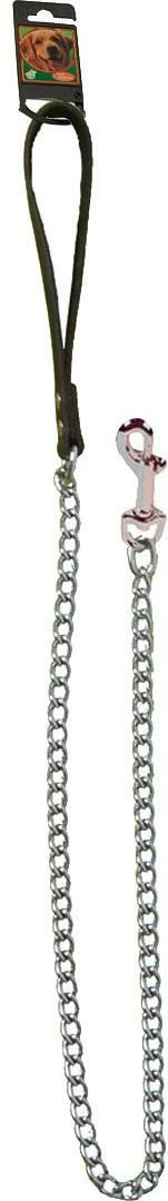 Deze hondenlijn met ketting heeft vele schakels en is voorzien van een leren handvat. Deze kettinglijn heeft een karabijnhaak en is daarmee eenvoudig te bevestigen aan de halsband.