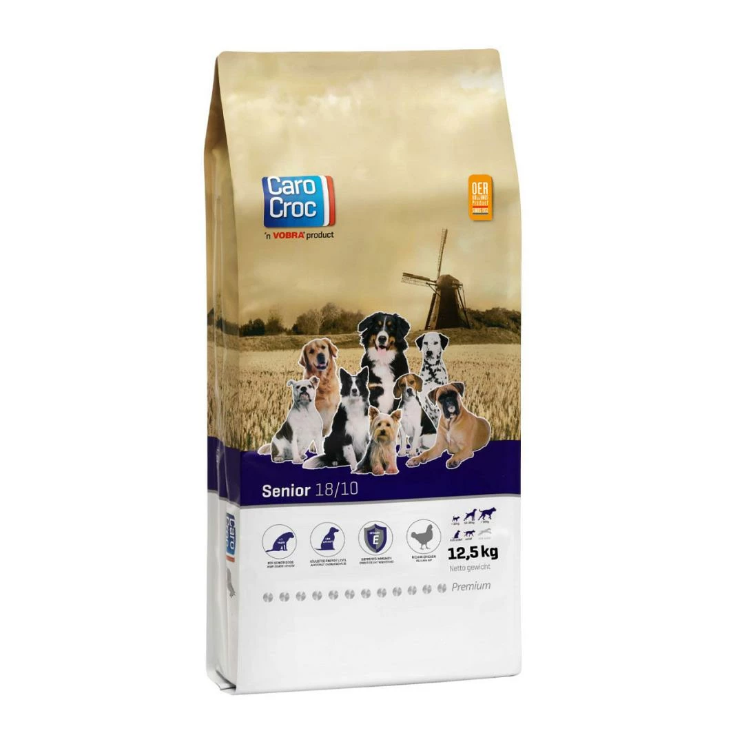 CaroCroc Senior 18/10 is een volledige voeding voor senior honden. Naarmate je hond ouder wordt, verandert de voedingsbehoefte. Oudere honden (vanaf ongeveer 7 jaar) hebben een lagere eiwit- en mineralenbehoefte. Voor het welzijn van je hond is het belangrijk de voeding hierop aan te passen. De samenstelling van CaroCroc Senior 18/10 is afgestemd op de behoefte van oudere honden. Hierdoor wordt de nier- en leverfunctie ondersteund.