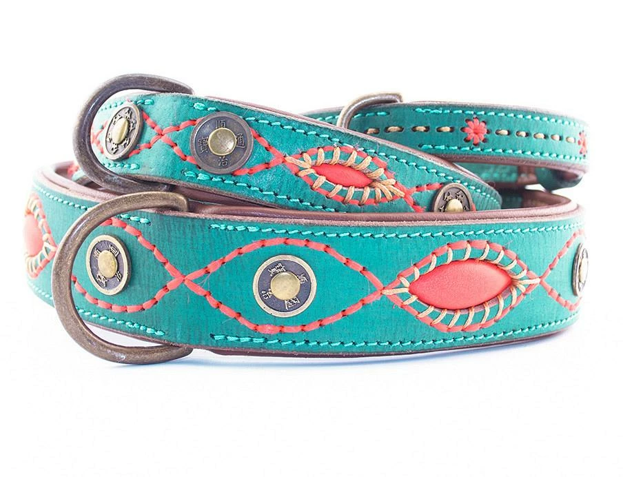 De Dog with a Mission halsband Janis is hand geverfd en daardoor zijn alle banden net iets anders. Janis is een prachtig turquoise leren halsband met handgestikte details en licht opgeschuurd voor een extra stoere look. Waanzinnig mooi handwerk en oersterk.