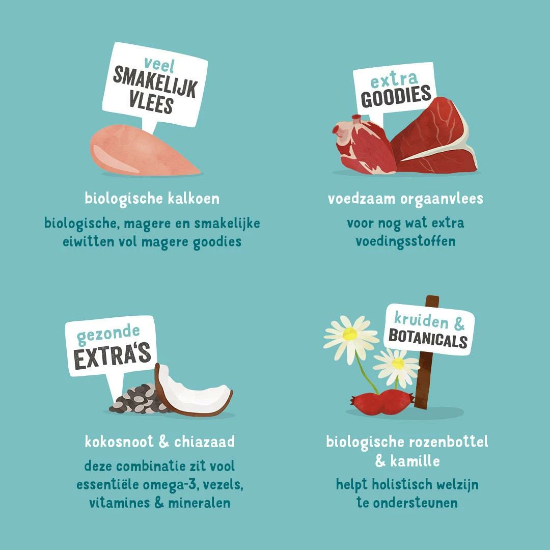 Samenstelling: Biologisch varken*, biologische kalkoen* 26%, biologische kip*, mineralen, biologische kokosnoot* 0,15%, biologische chiazaden* 0,15%, biologische rozenbottels 0,1%, biologische kamille 0,1%.