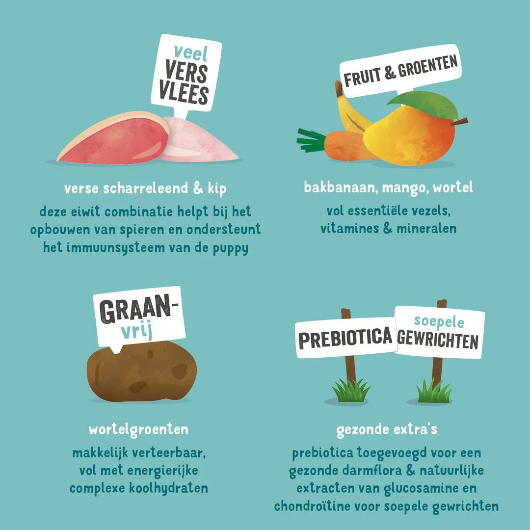 • Verse scharreleend zit vol met proteïnen om de spieren van puppy’s te versterken