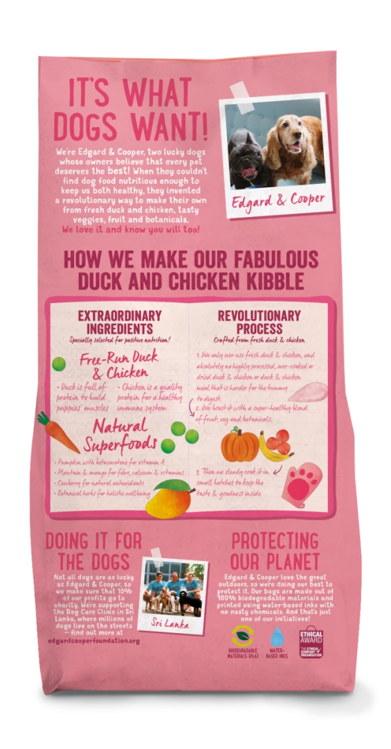 In Edgard & Cooper hondenvoer Puppy scharreleend en scharrelkip wordt enkel verse scharreleend en verse scharrelkip gebruikt en absoluut geen bewerkte, overgare of gedroogde eend en kip of meel van eend of kip dat moeilijker is voor de buikjes om te verteren. Daarnaast wordt er een supergezonde mix van fruit, groenten en kruiden toegevoegd.