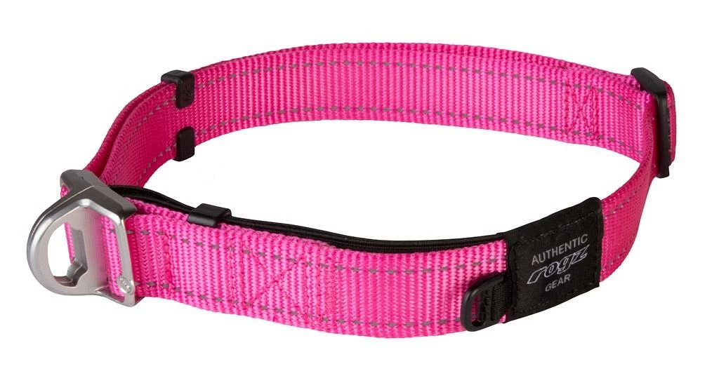 De Rogz Beltz Utility halsband Safety is een duurzame nylon halsband die speciaal is ontwikkeld voor de veiligheid van je hond. De magneetsluiting met twee gespen zal zich openen als bijvoorbeeld bij het spelen met een andere hond te uitbundig wordt getrokken of als de halsband ergens aan blijft hangen. Als de sluiting zich opent, zal het elastiek (dat achter de sluiting zit) ruim uitrekken zodat je hond veilig kan ontsnappen.